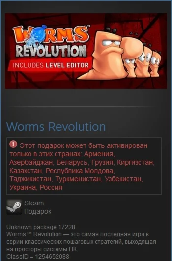 "Worms™ Revolution – это самая последняя игра в серии классических пошаговых стратегий, выходящая на просторы системы ПК, с множеством захватывающих новых опций и великолепной трехмерной графикой, сохранившей классические черты двухмерного геймплея, столь обожаемого поклонниками. Играйте во всестороннем режиме одиночной игры, включающем как кампании, так и миссии головоломки, или же сразу же окунитесь в многопользовательские боевые действии, играя локально или в Интернете. Впервые в истории в игру включены динамическая вода, физические объекты и классы червей! Самостоятельно выбирайте классы, которыми будете играть, их внешний вид и даже то, каким образом они разговаривают!